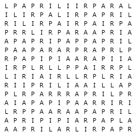 Can you find every occurrence of the word APRIL that appears in this grid (horizontally, vertically, or diagonally)?