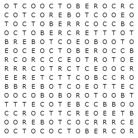 Can you find every occurrence of the word OCTOBER that appears in this grid (horizontally, vertically, or diagonally)?