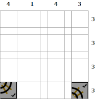 As this is 4 × 4 puzzle we know that every square in these columns is a track piece (but we're not yet sure in which direction). Clicking the squares will place an unknown track piece.