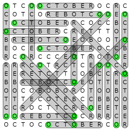 Can you find every occurrence of the word OCTOBER that appears in this grid (horizontally, vertically, or diagonally)?