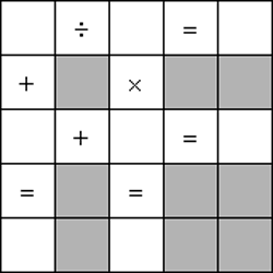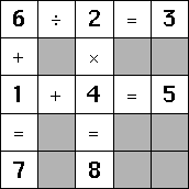 Each empty white square in the grid contains one of the numbers 1, 2, 3, …, 8. Each of the horizontal and vertical equations must be true, and each number must be used exactly once.