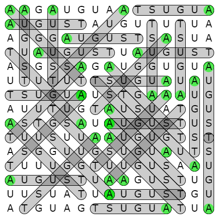Can you find every occurrence of the word AUGUST that appears in this grid (horizontally, vertically, or diagonally)?
