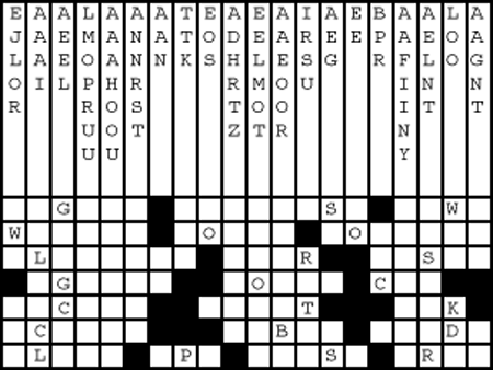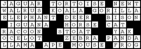 Below is a grid which should contain animals. The missing letters for a particular column are listed at the top of that column. Can you 'drop' the missing letters in and complete the grid? Each animal begins with a different letter of the alphabet.