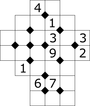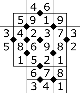 Fill in the missing numbers with the digits 1 to 9. A diamond shape in the middle means that the four numbers around it add to 20.