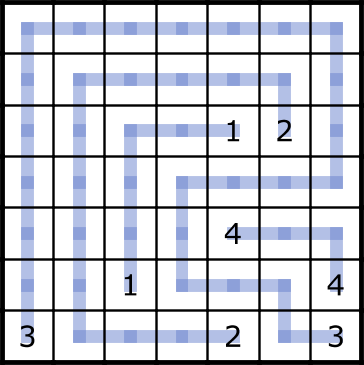 Using only horizontal and vertical lines, connect every number to its pair (1 goes to 1, 2 goes to 2, etc). The lines must not cross each other.